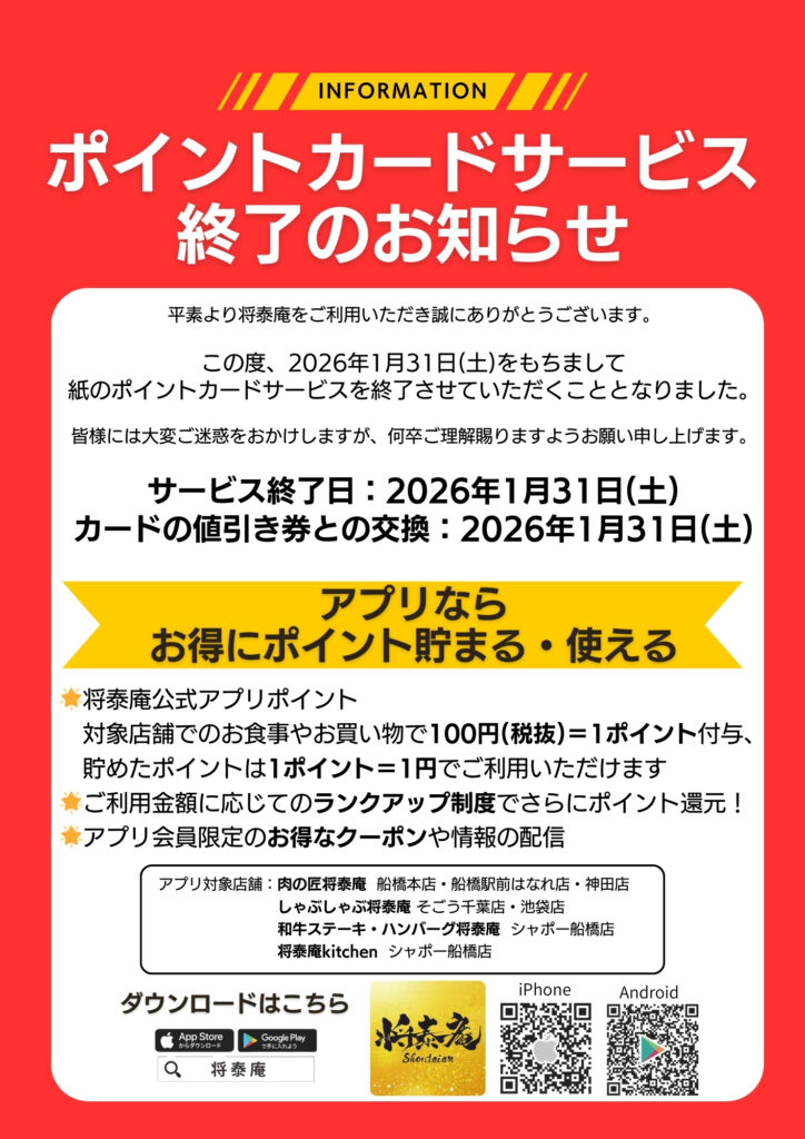 このたび誠に勝手ながら、紙のポイントカードサービスを2026年1月31日(土)をもちまして終了させていただくこととなりました。